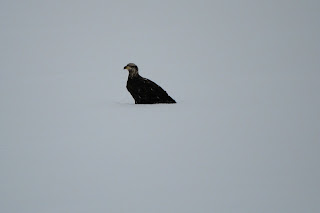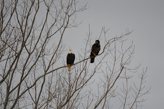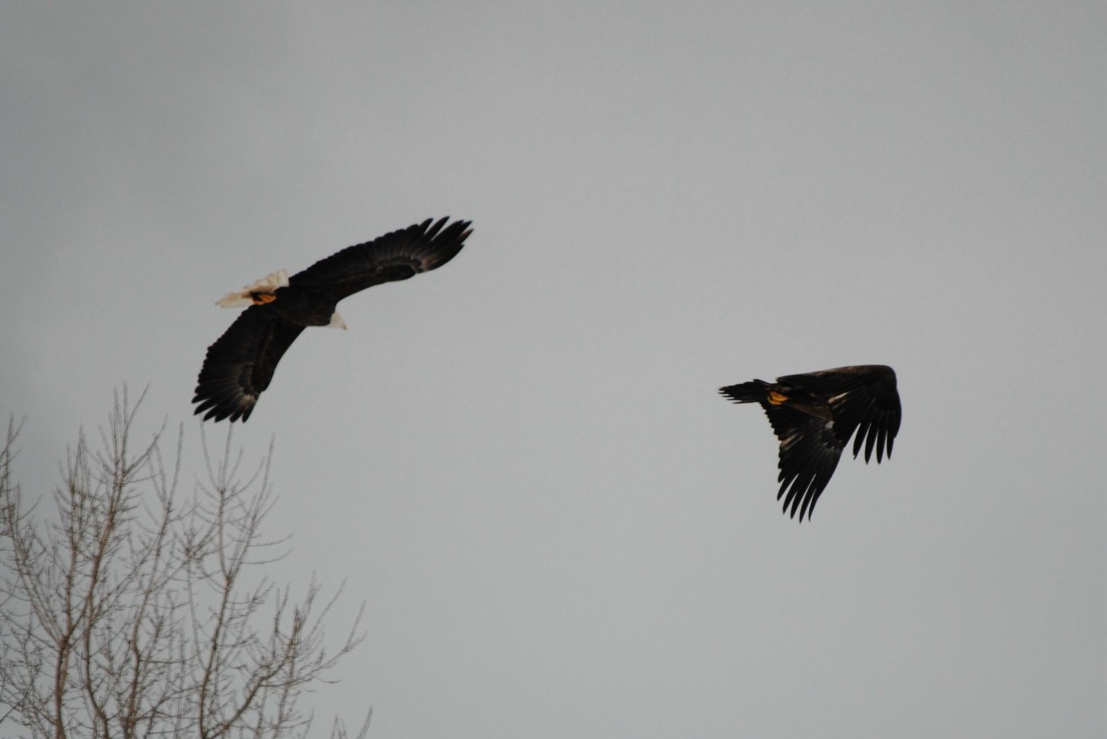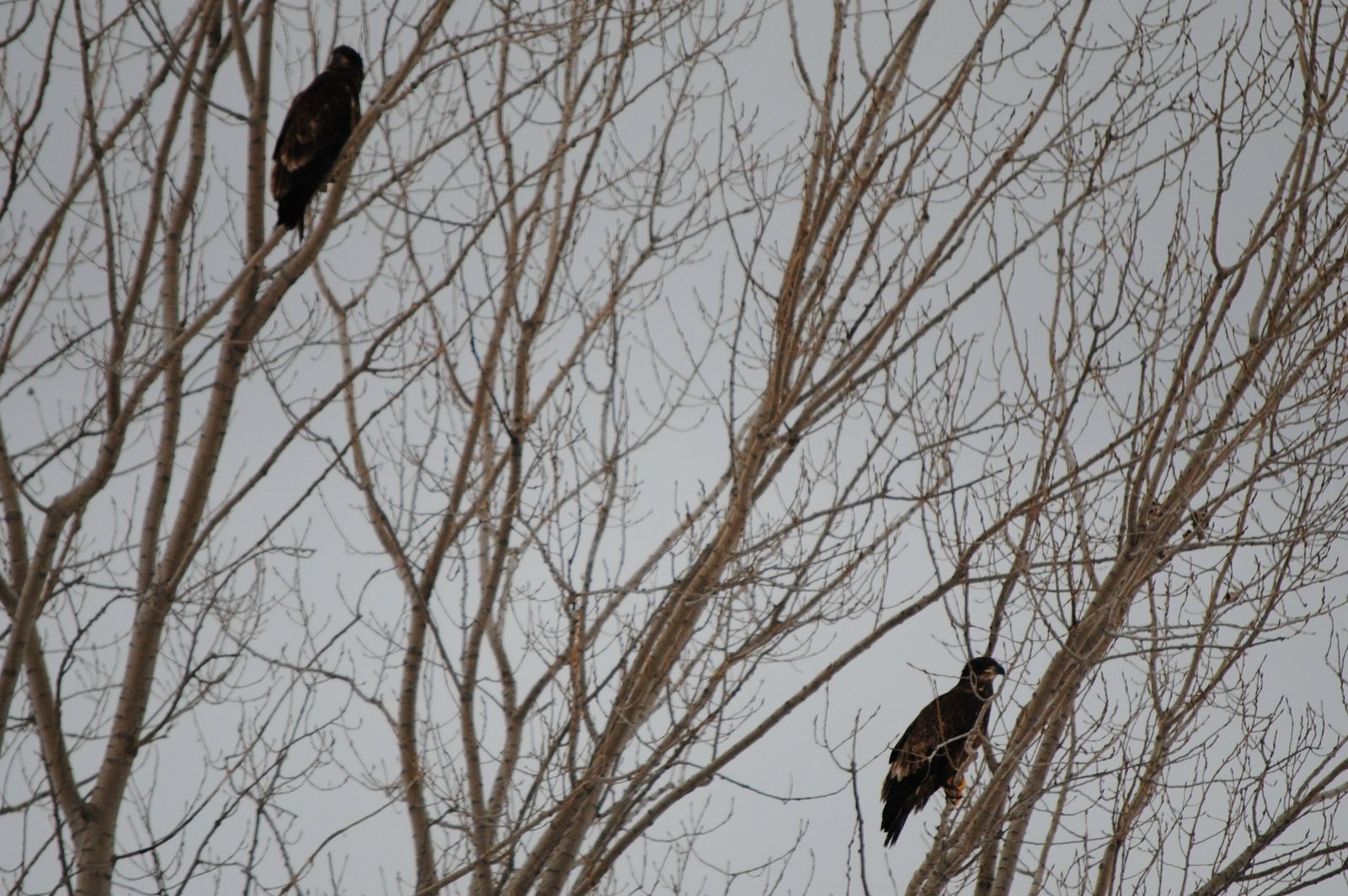 I just thought I would let you know, the "golden's" are in actuality immature Bald Eagles. The one's in the trees look younger than the one on the ice, as you can see the head and tail feathers are changing on the "ice" Bird -- I'd say that one is about 2 1/2 yrs. old or so, where as the others are probably first years, but none (sorry) are a Golden Eagle. :(
